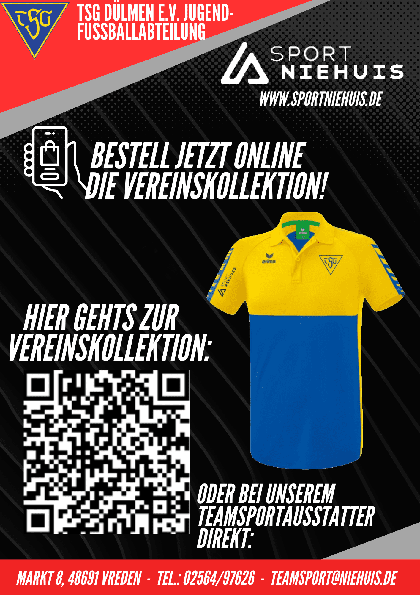 Wir haben den Wunsch nach einer einfachen Bestellung, Bezahlung (PayPal oder Rechung) sowie der direkten Lieferung nach Hause umsetzen können. Dazu steht uns ein Onlineshop zur Verfügung. Hier können einzelne Produkte gezielt ausgesucht, bestellt, bezahlt und direkt mit der Beflockung versehen werden. Ihr gelangt über die Seite www.sportniehuis.de auf unseren TSG Vereinsshop. Bei jeder Bestellung wird direkt nur das TSG Logo sowie das Logo von Sport Niehuis (kostenfrei) aufgebracht. Wir haben zusätzlich attraktive Preise für die Produkte erzielen können.