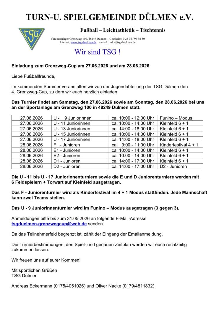 im kommenden Sommer veranstalten wir von der Jugendabteilung der TSG Dülmen den 2. Grenzweg-Cup, zu dem wir euch herzlich einladen.